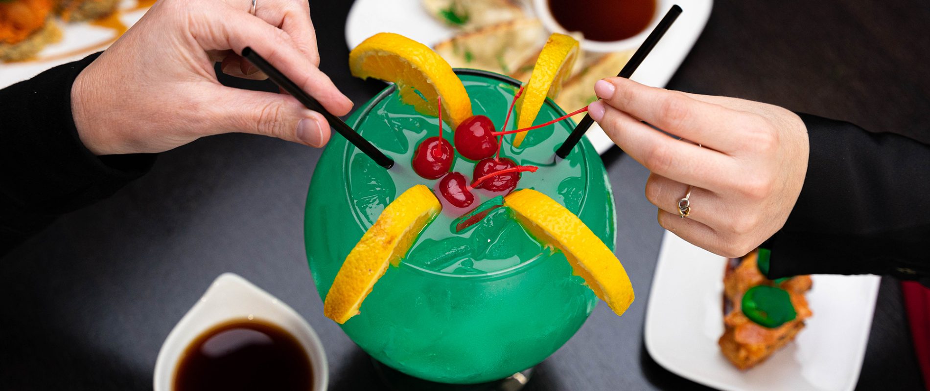 sake, blue curaçao and tropical fruit juices.